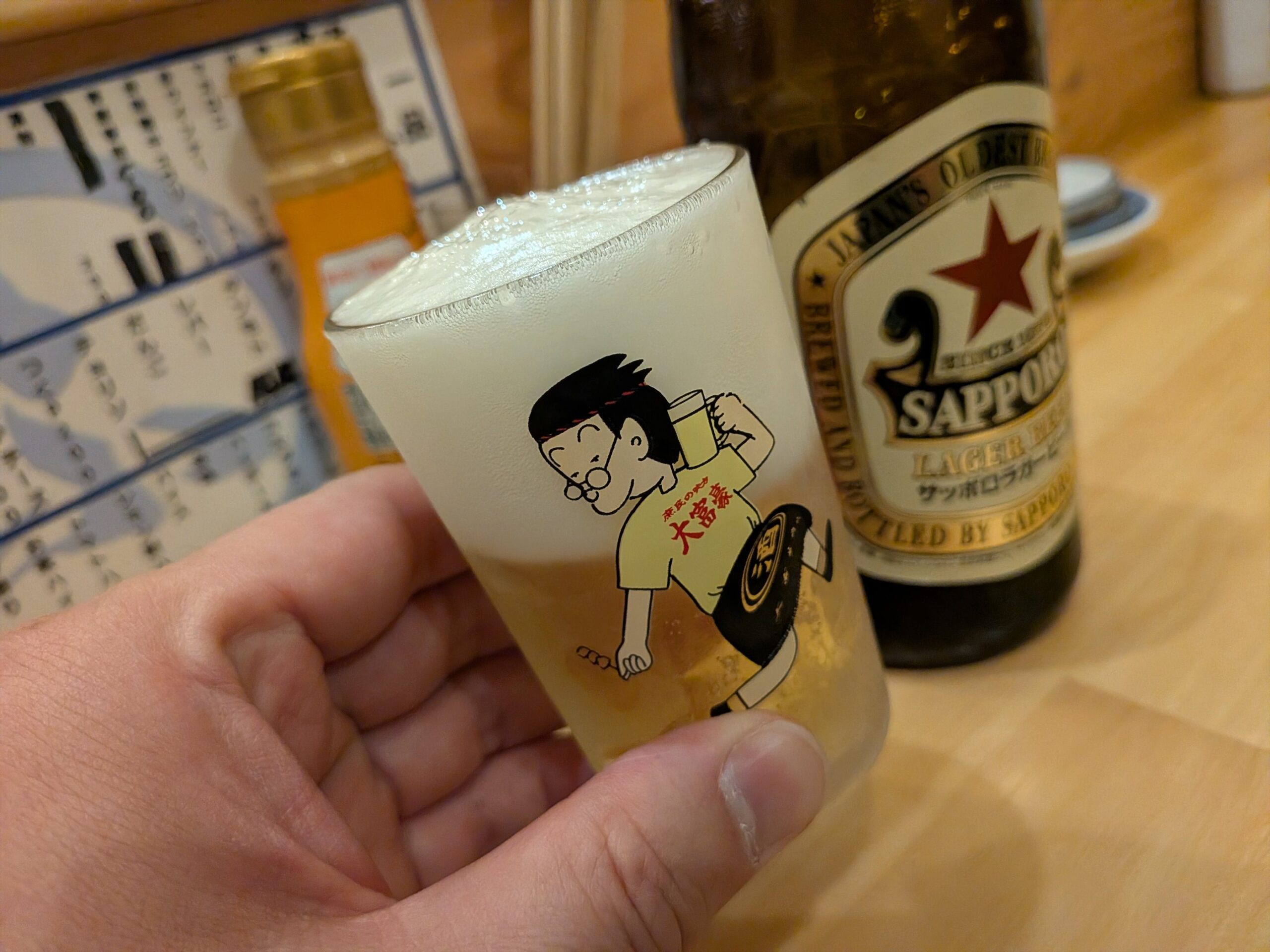 瓶ビールを頼んだら、グラスに載ってる絵にビックリ!!
